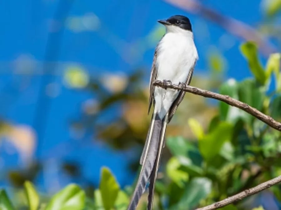 This beautiful little bird has a characteristic extremely long forked tail. That is why in Spanish it is called tail of scissors or tijereta and in English Fork-tailed Flycatcher, which could be loosely translated as fork-tailed fly catcher.